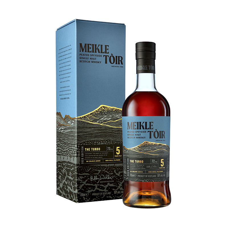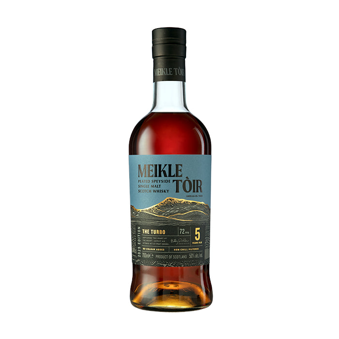 Die Turbo 2025 Edition der Meikle Tòir-Reihe aus der GlenAllachie Distillery ist ein stark getorfter Single Malt mit satten 72 ppm. Gereift in einer Mischung aus amerikanischen Virgin Oak Casks und Oloroso Sherry Hogsheads, vereint er extreme Rauchigkeit mit üppigen Frucht- und Würznoten.